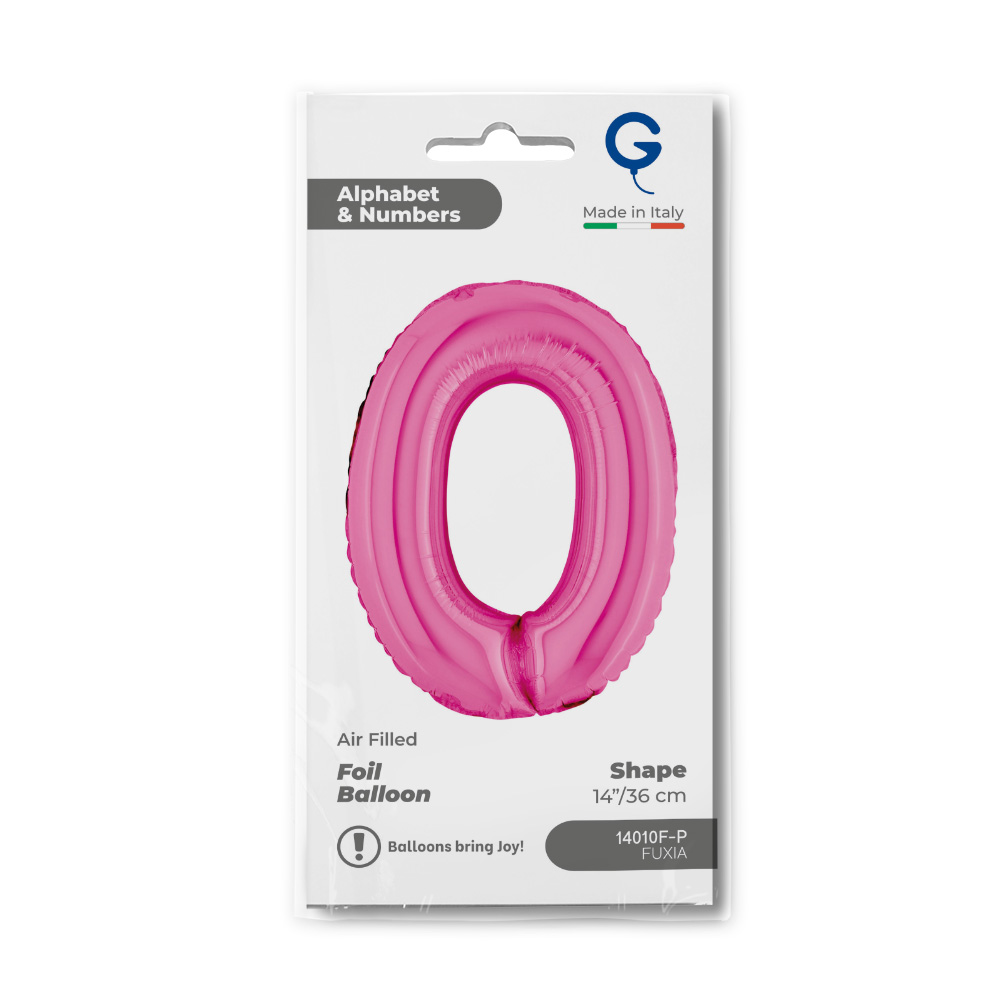 Foliový balónek ve tvaru číslice 0 ve fuchsia barvě. Balonky jsou baleny v prodejním balení.
