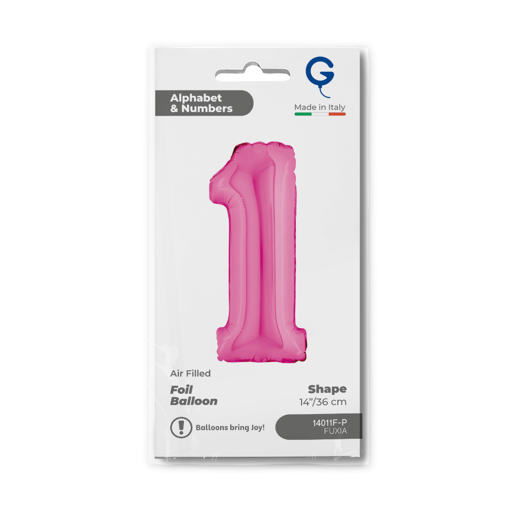 Foliový balónek ve tvaru číslice 1 ve fuchsia barvě. Balonky jsou baleny v prodejním balení.