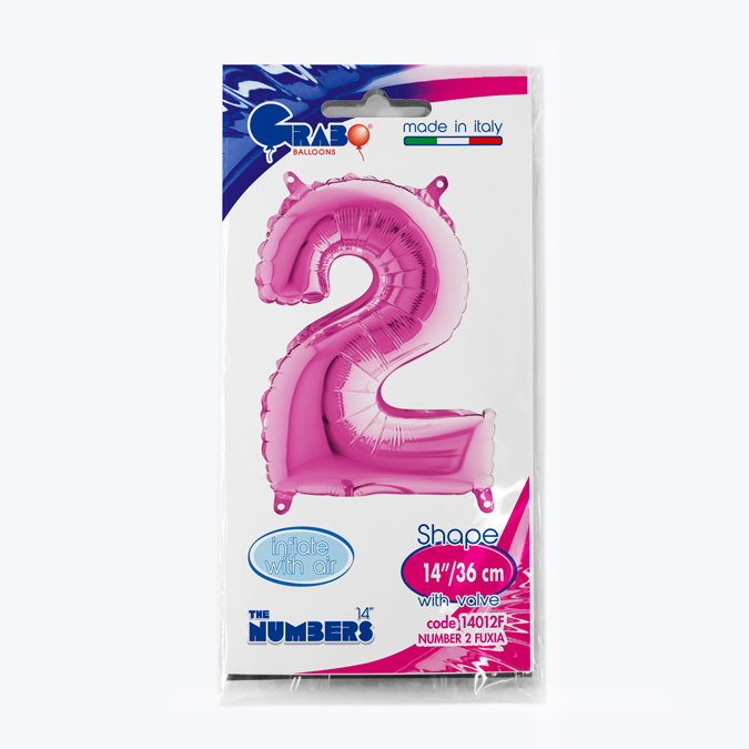 Foliový balónek ve tvaru číslice 2 ve fuchsia barvě. Balonky jsou baleny v prodejním balení.