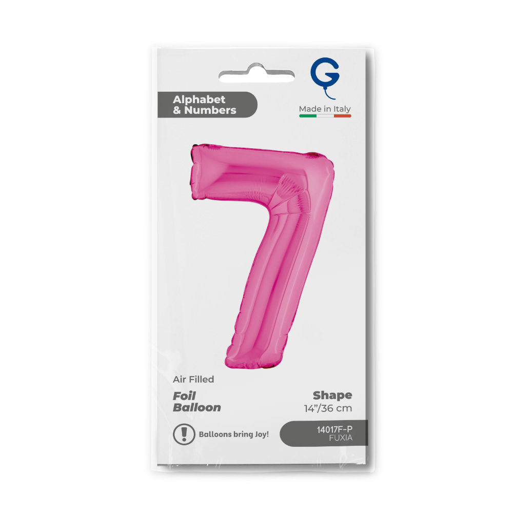 Foliový balónek ve tvaru číslice 7 ve fuchsia barvě. Balonky jsou baleny v prodejním balení.