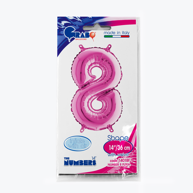 Foliový balónek ve tvaru číslice 8 ve fuchsia barvě. Balonky jsou baleny v prodejním balení.