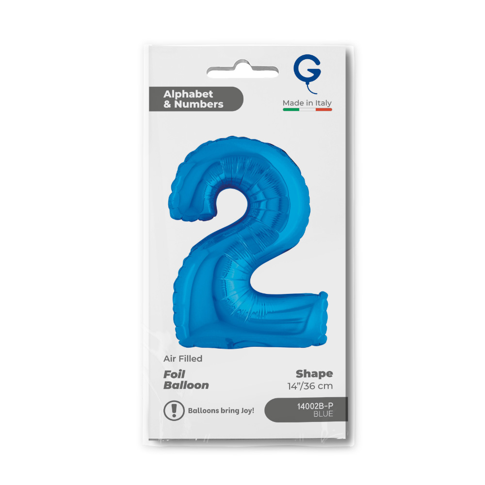 Foliový balónek ve tvaru číslice 2 v modré barvě. Balonky jsou baleny v prodejním balení.