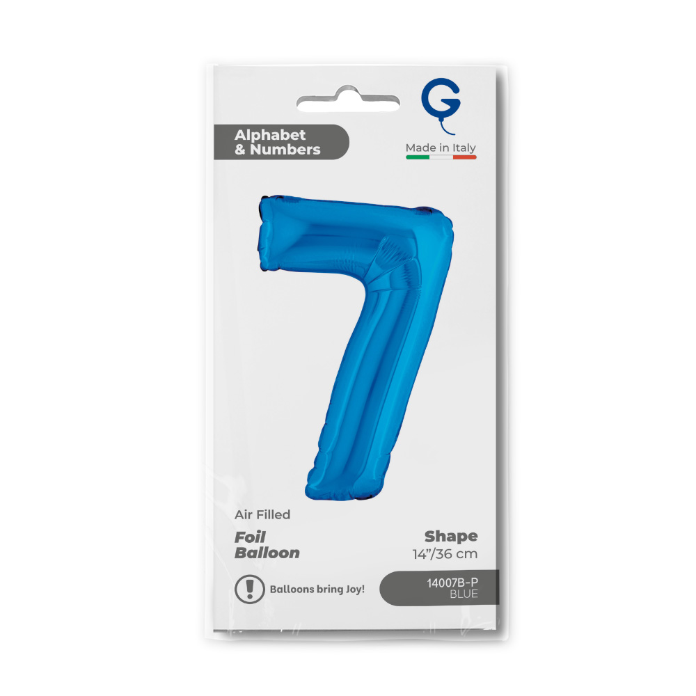 Foliový balónek ve tvaru číslice 7 v modré barvě. Balonky jsou baleny v prodejním balení.