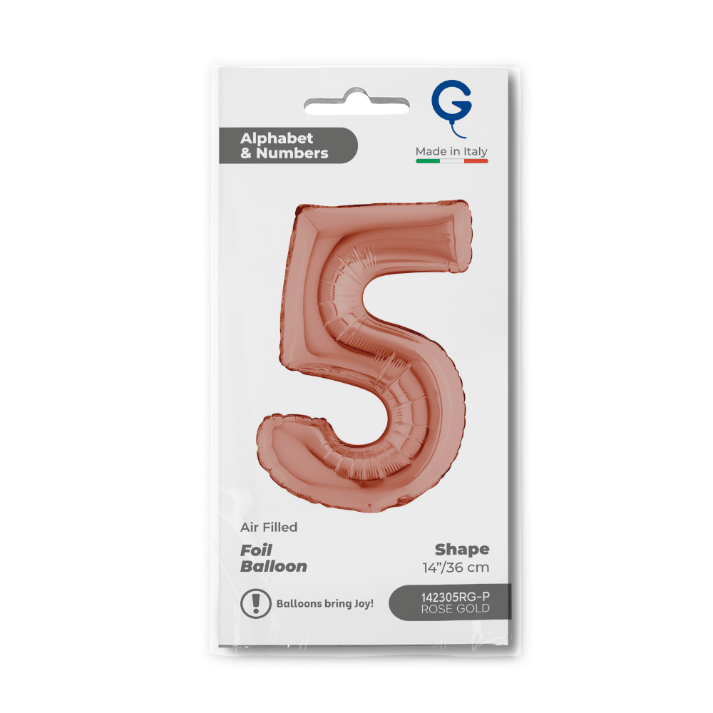 Foliový balónek ve tvaru číslice 5 v rosegold barvě. Balonky jsou baleny v prodejním balení.