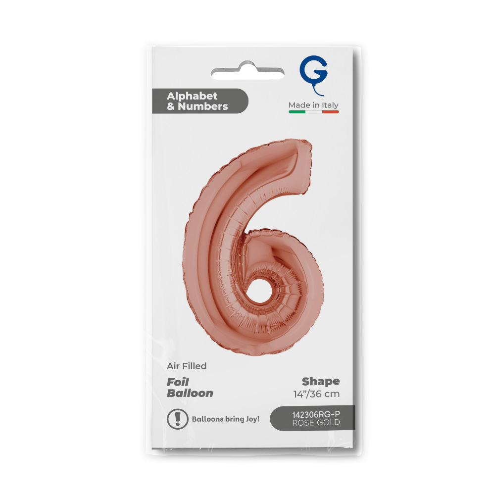 Foliový balónek ve tvaru číslice 6 v rosegold barvě. Balonky jsou baleny v prodejním balení.