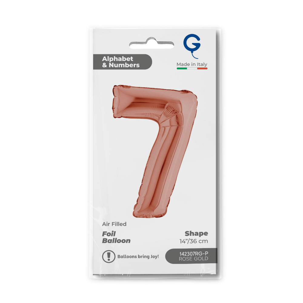 Foliový balónek ve tvaru číslice 7 v rosegold barvě. Balonky jsou baleny v prodejním balení.