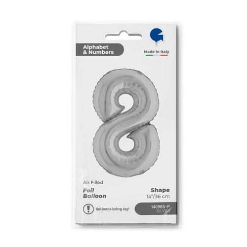 Foliový balónek ve tvaru číslice 8 ve stříbrné barvě.