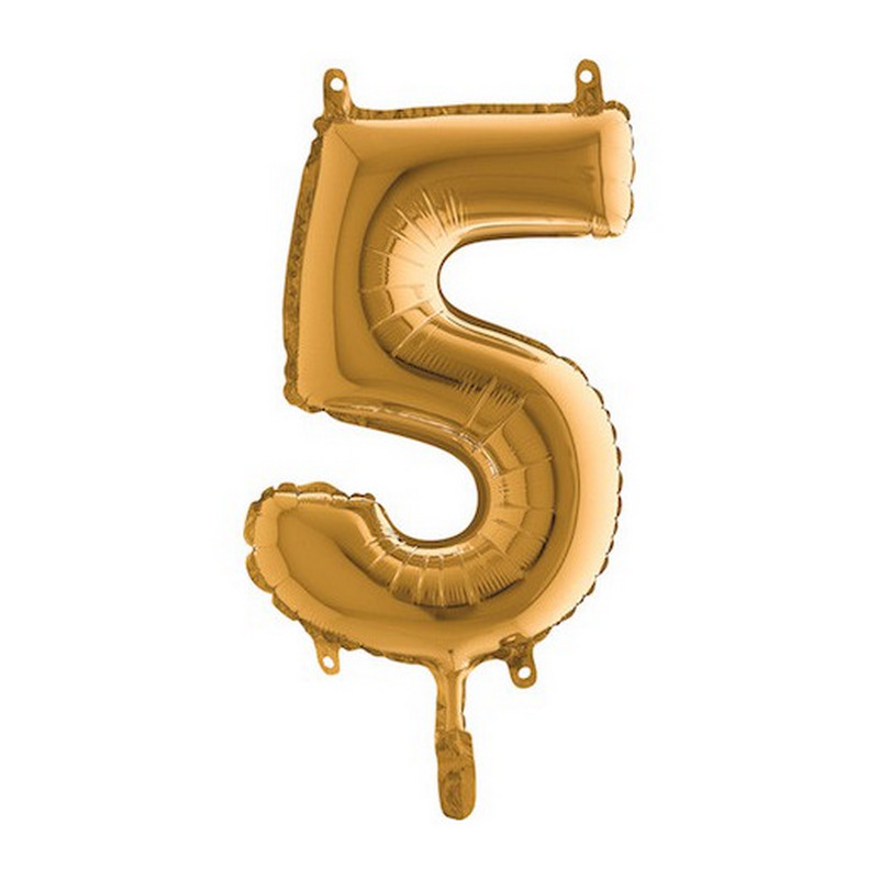 Foliový balónek ve tvaru číslice 5 ve zlaté barvě. Balonky nejsou baleny v prodejním balení.