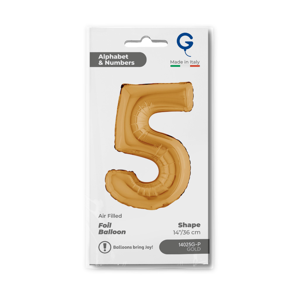 Foliový balónek ve tvaru číslice 5 ve zlaté barvě. Balonky nejsou baleny v prodejním balení.