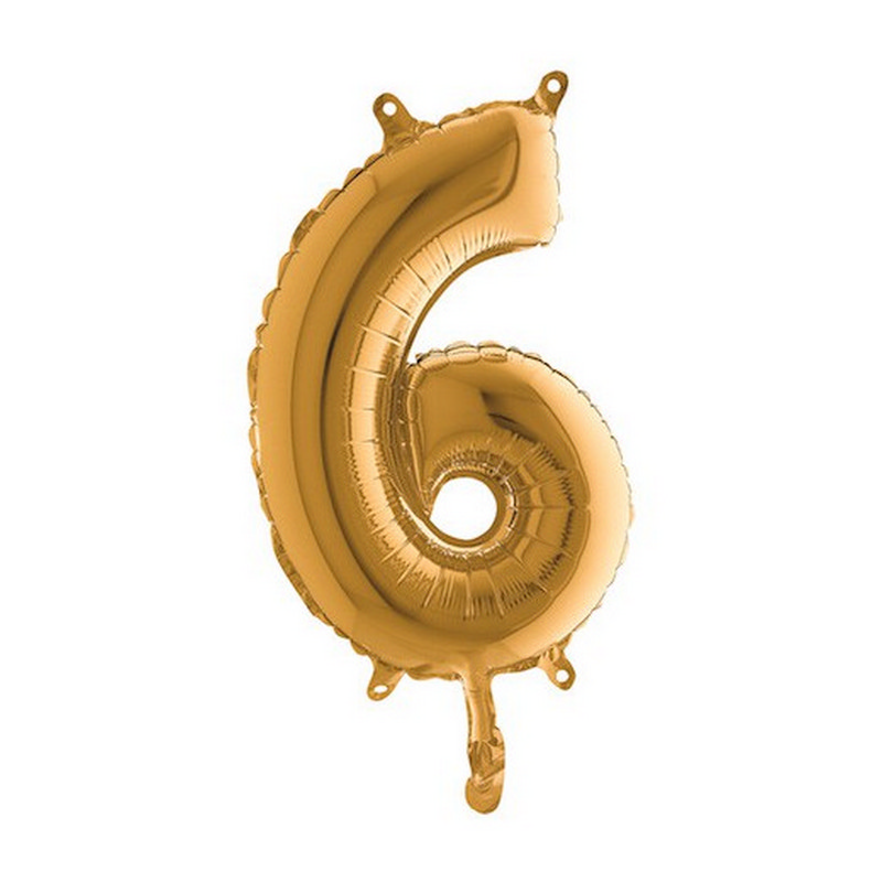 Foliový balónek ve tvaru číslice 6 ve zlaté barvě. Balonky nejsou baleny v prodejním balení.