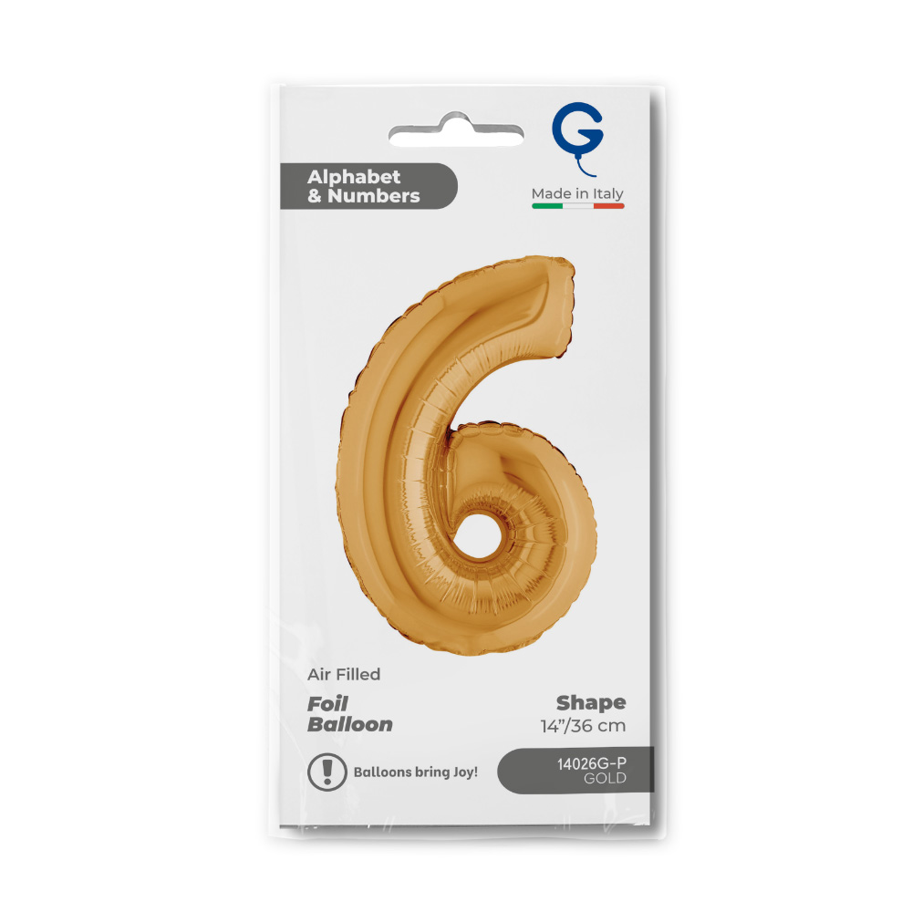 Foliový balónek ve tvaru číslice 6 ve zlaté barvě.