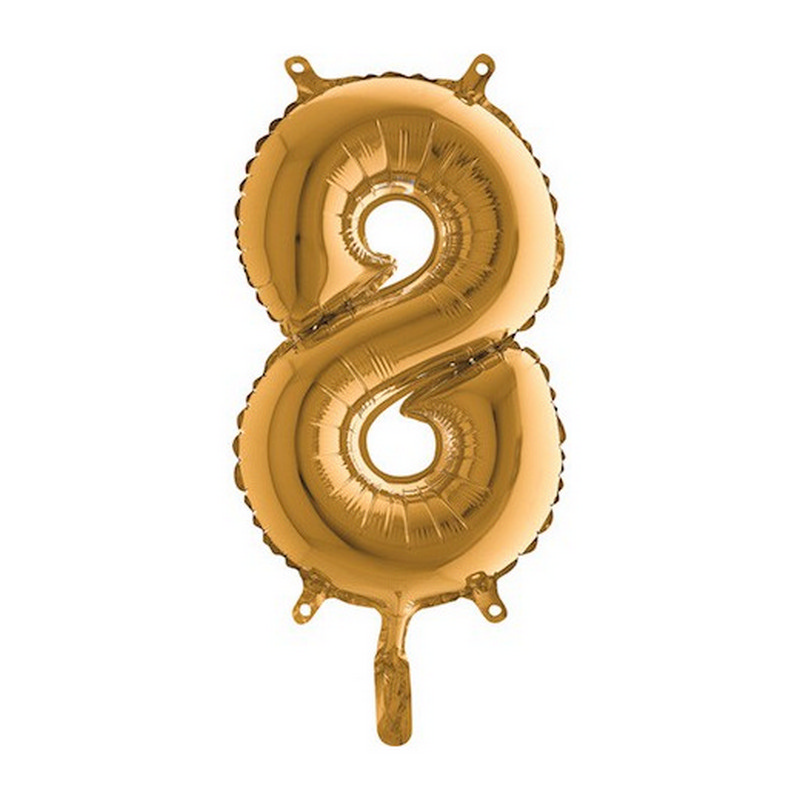 Foliový balónek ve tvaru číslice 8 ve zlaté barvě. Balonky nejsou baleny v prodejním balení.