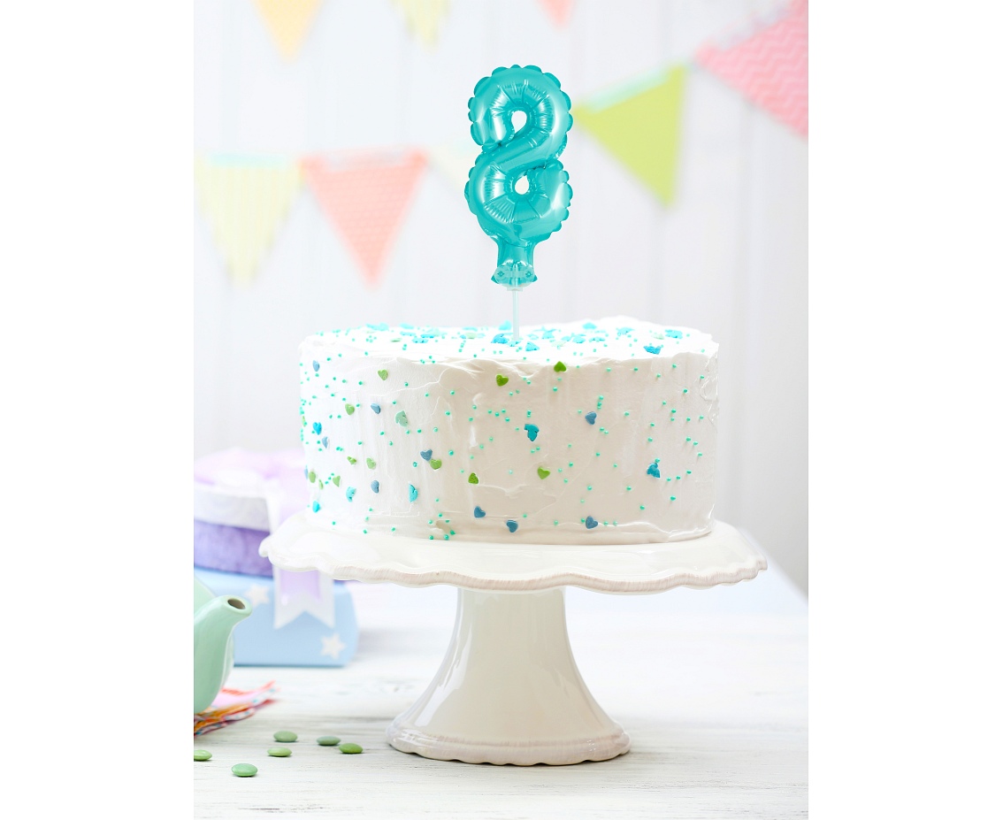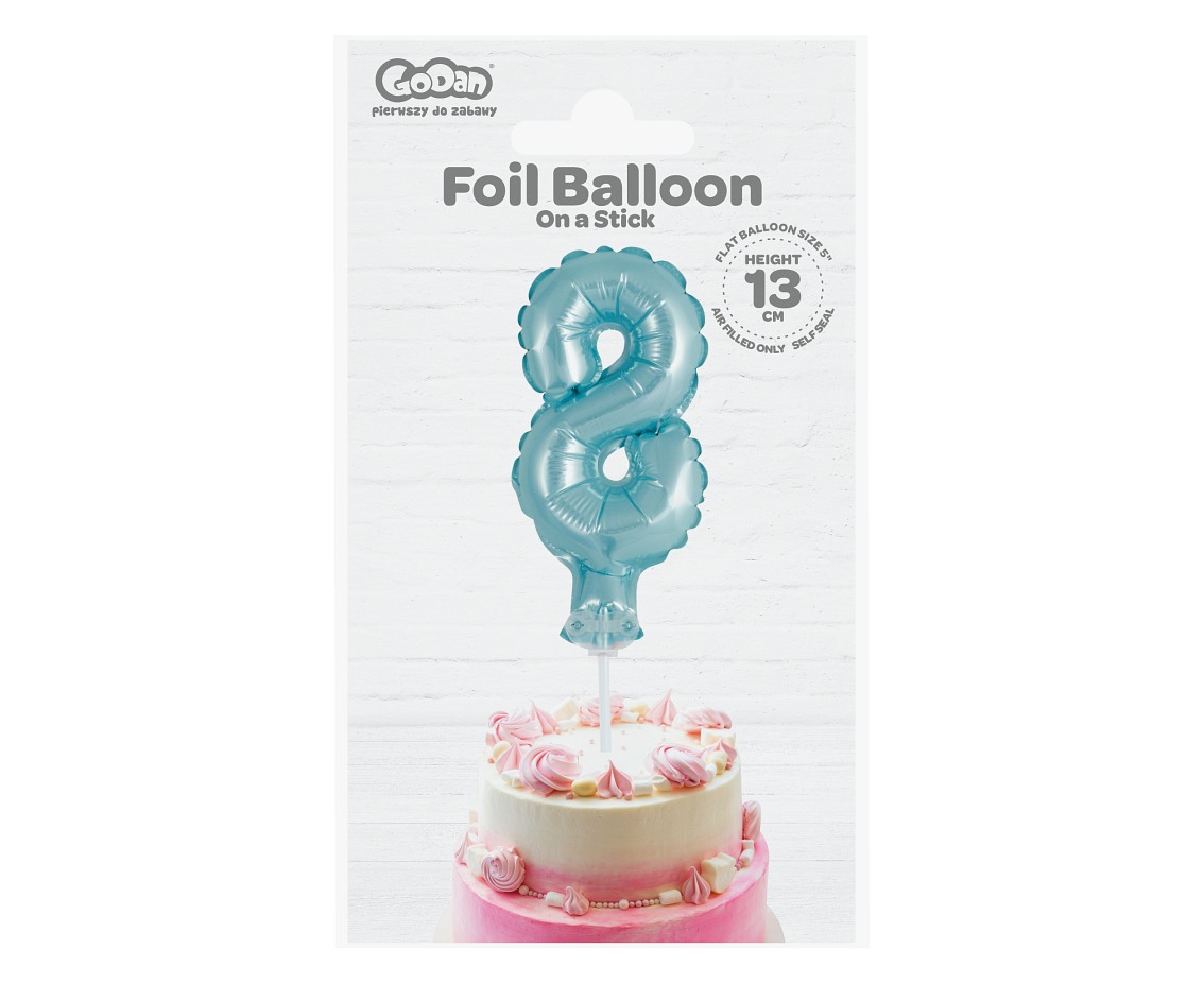 Foliový balónek ve tvaru číslice 8 ve světle modré barvě. Balonky jsou baleny v prodejním balení. Vhodné i na dort!