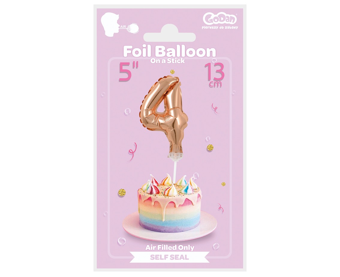 Foliový balónek ve tvaru číslice 4 v růžovo-zlaté barvě. Balonky jsou baleny v prodejním balení. Vhodné i na dort!