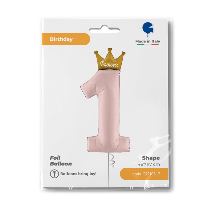 Fóliový balónek ve tvaru číslice jedna s korunkou ve velikosti 102cm.
