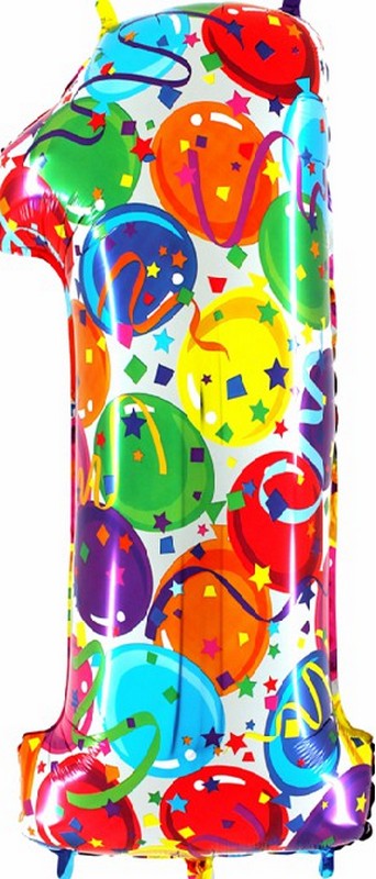 Fóliový balónek číslice 1 je barevný s motivy balónků, je velký 102 cm a je vhodným doplňkem výroční, novoroční i narozeninové výzdoby.