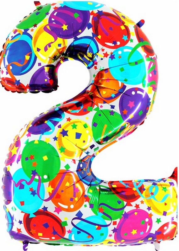Fóliový balónek číslice 2 je barevný s motivy balónků, je velký 102 cm a je vhodným doplňkem výroční, novoroční i narozeninové výzdoby.