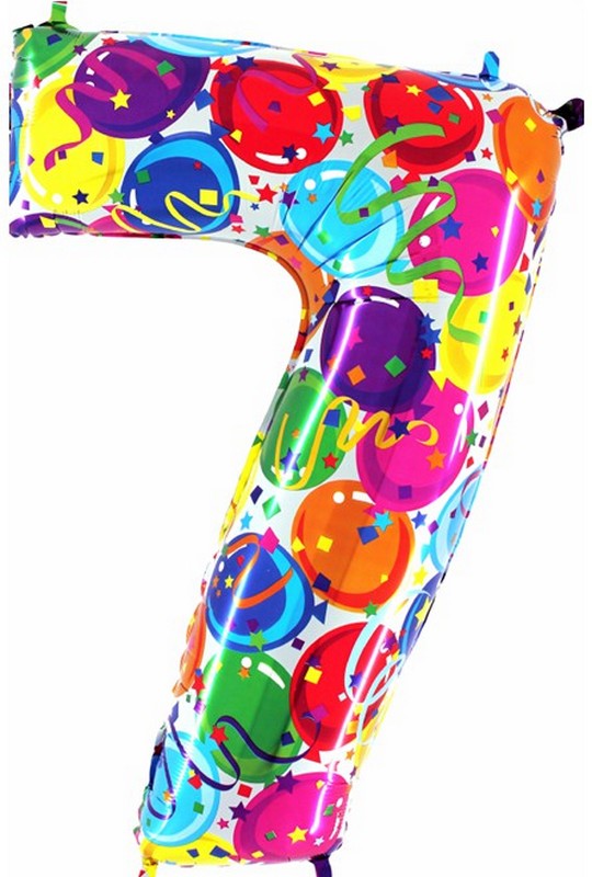 Fóliový balónek číslice 7 je barevný s motivy balónků, je velký 102 cm a je vhodným doplňkem výroční, novoroční i narozeninové výzdoby.