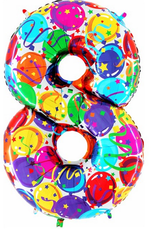 Fóliový balónek číslice 8 je barevný s motivy balónků, je velký 102 cm a je vhodným doplňkem výroční, novoroční i narozeninové výzdoby.