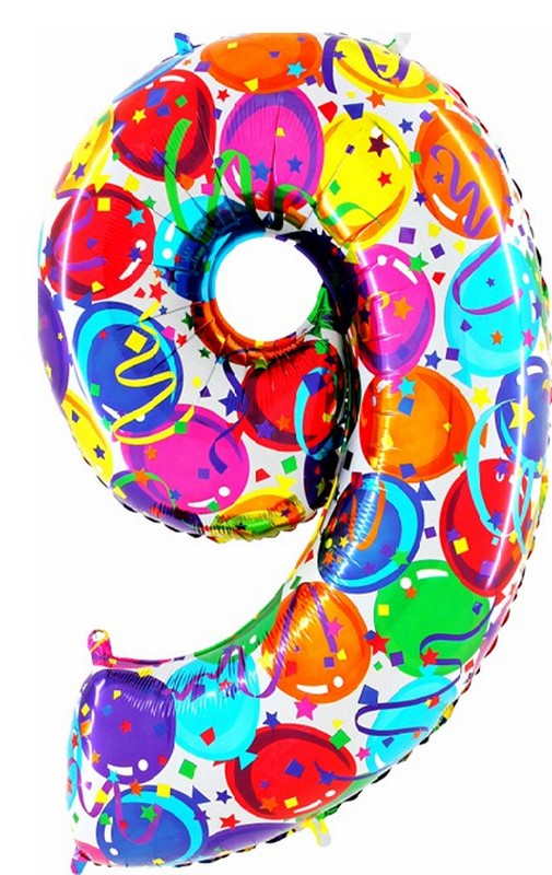 Fóliový balónek číslice 9 je barevný s motivy balónků, je velký 102 cm a je vhodným doplňkem výroční, novoroční i narozeninové výzdoby.