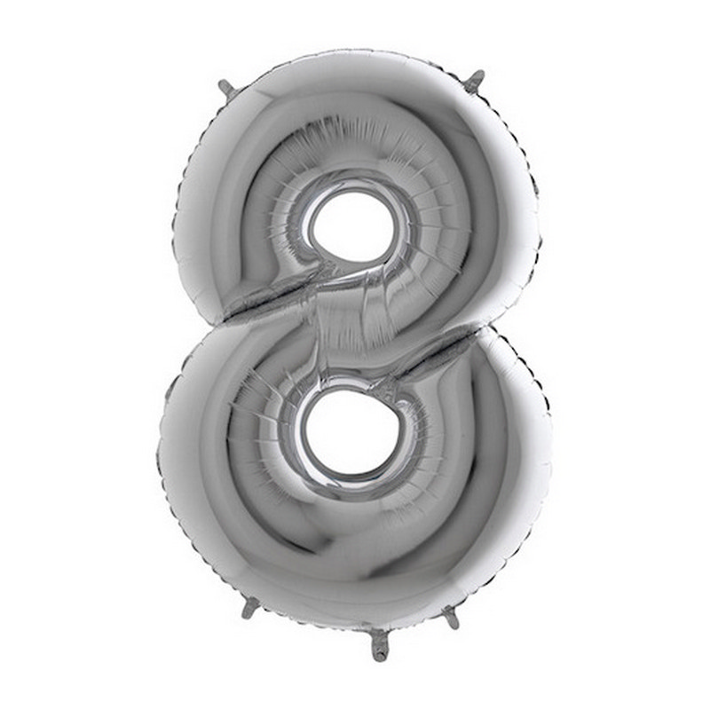 Fóliový balónek číslice 8 ve stříbrné barvě je velký 102 cm a je vhodným doplňkem výroční, novoroční i narozeninové výzdoby.