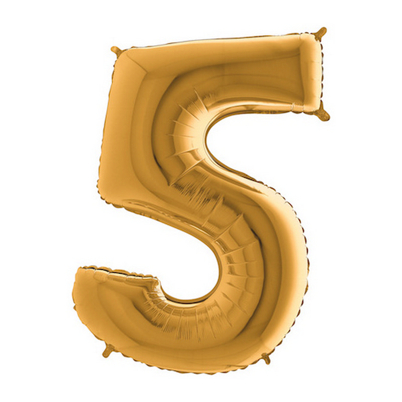 Fóliový balónek číslice 5 ve zlaté barvě je velký 102 cm a je vhodným doplňkem výroční, novoroční i narozeninové výzdoby.