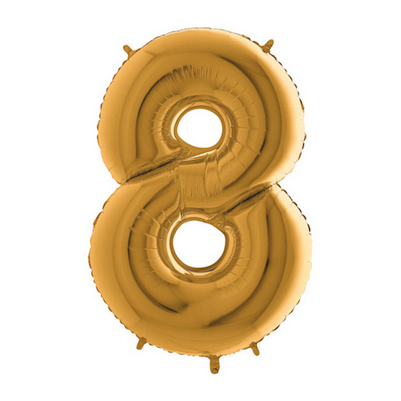 Fóliový balónek číslice 8 ve zlaté barvě je velký 102 cm a je vhodným doplňkem výroční, novoroční i narozeninové výzdoby.