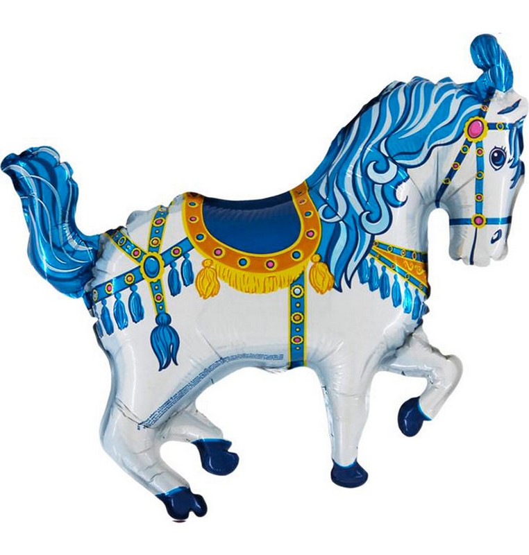 Fóliový balónek znázorňuje cirkusového koníka v modré barvě. Tyto balónky jsou určeny k uvázání na tyčku s kloboučkem, k nafukování heliem nejsou vhodné.