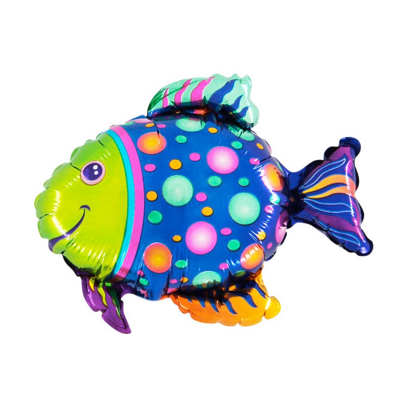 Fóliový balónek znázorňuje rybu v zářivých barvách. Tyto balónky jsou určeny k uvázání na tyčku s kloboučkem, k nafukování heliem nejsou vhodné.