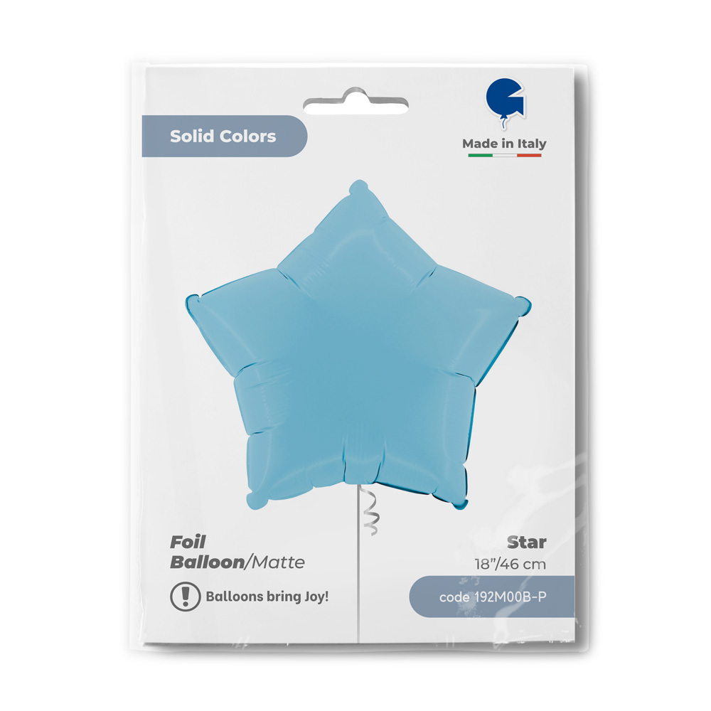 Foliový balónek v matně modré barvě ve tvaru hvězdy, výška 46cm. Vhodné pro nafukování heliem i vzduchem.