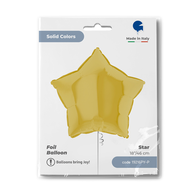 Foliový balónek ve žluté barvě ve tvaru hvězdy, výška 46cm. Vhodné pro nafukování heliem i vzduchem.