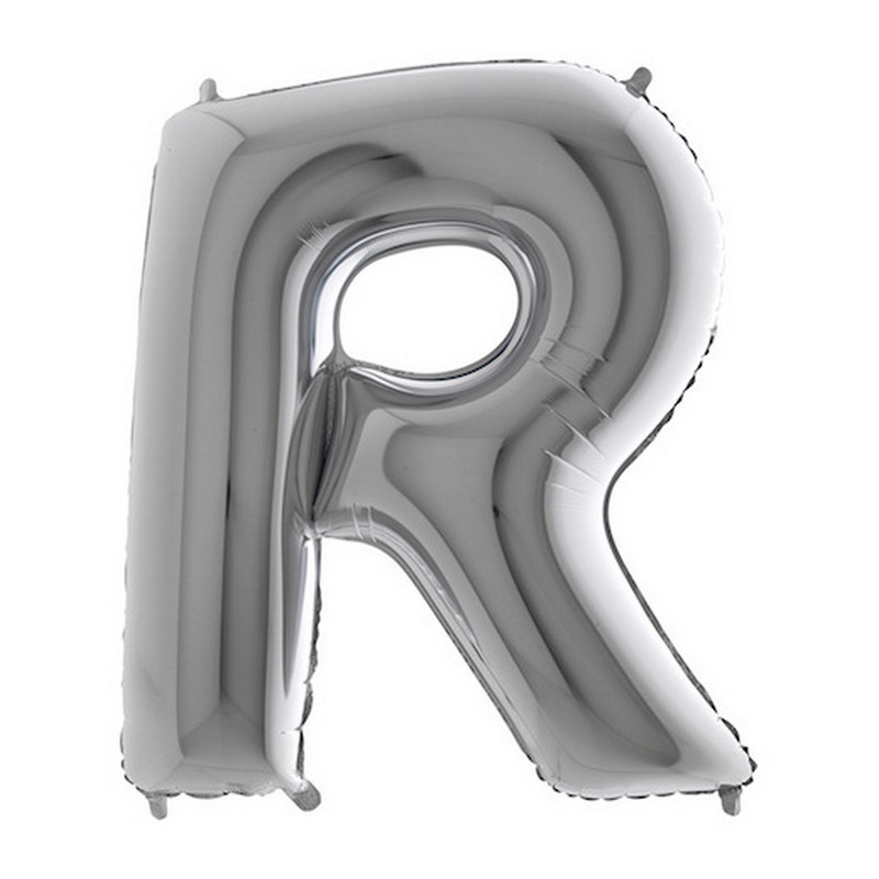 Stříbrné písmeno ve tvaru R, výška 102cm. Jsou vhodné pro nafukování heliem i vzduchem.