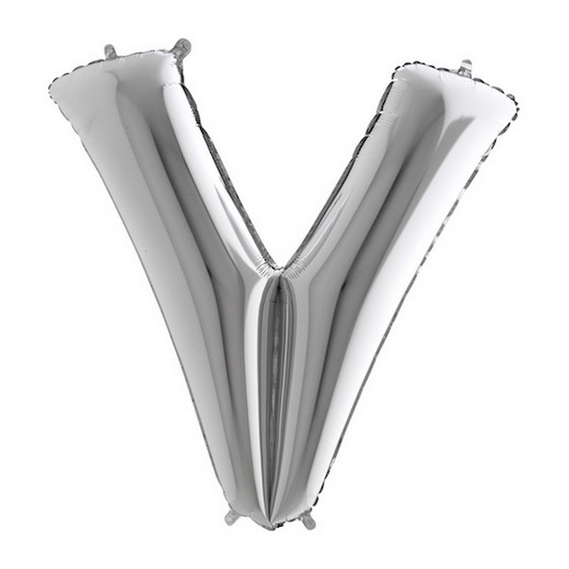 Stříbrné písmeno ve tvaru V, výška 102cm. Jsou vhodné pro nafukování heliem i vzduchem.