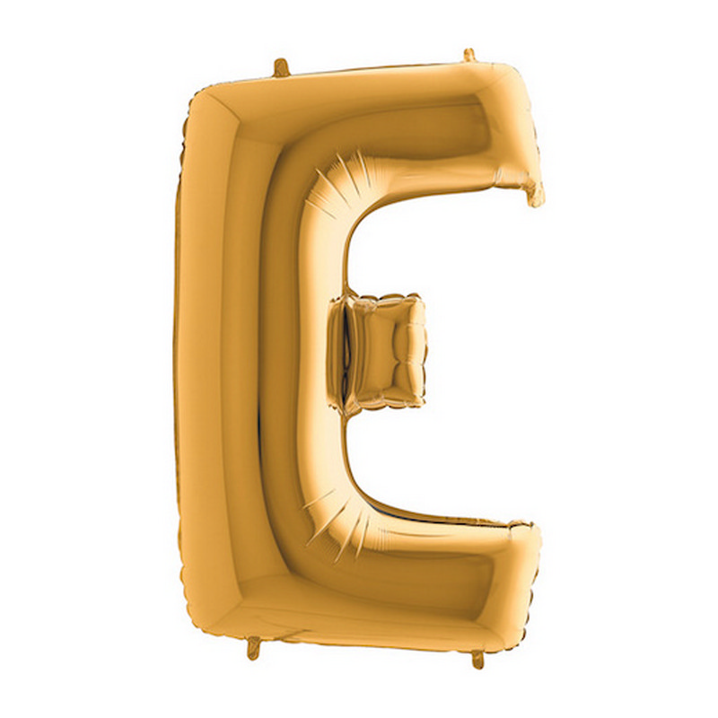 Zlaté písmeno ve tvaru E, výška 102cm. Jsou vhodné pro nafukování heliem i vzduchem.