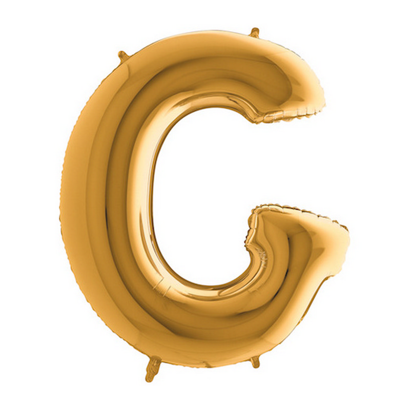Zlaté písmeno ve tvaru G, výška 102cm. Jsou vhodné pro nafukování heliem i vzduchem.