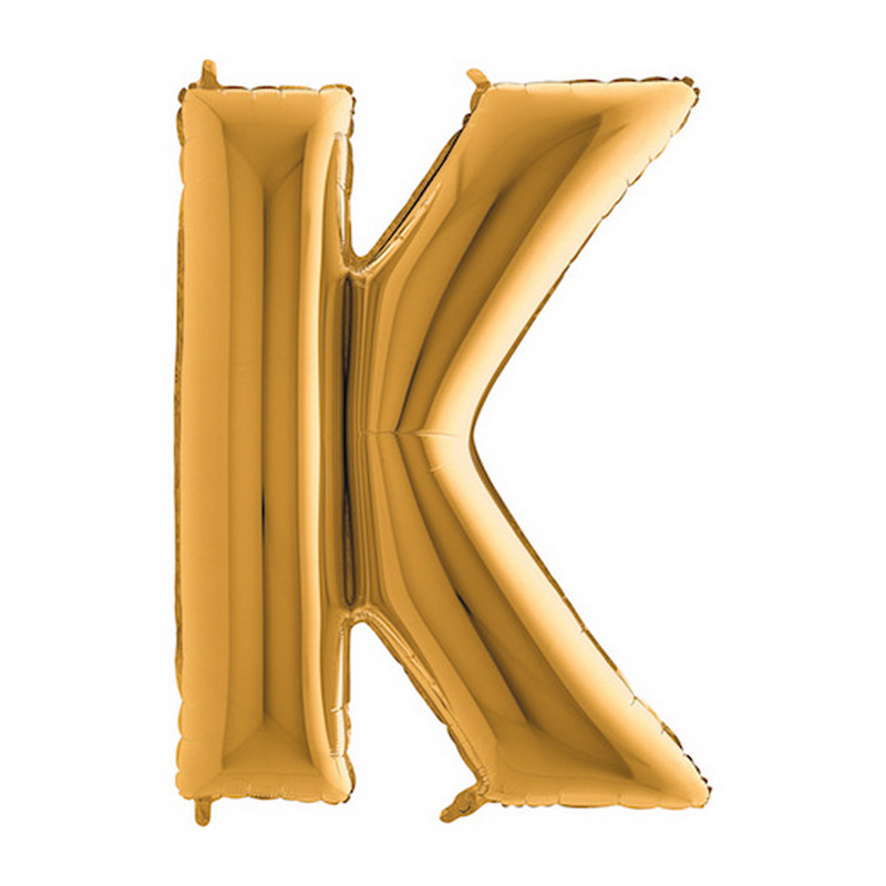Zlaté písmeno ve tvaru K, výška 102cm. Jsou vhodné pro nafukování heliem i vzduchem.