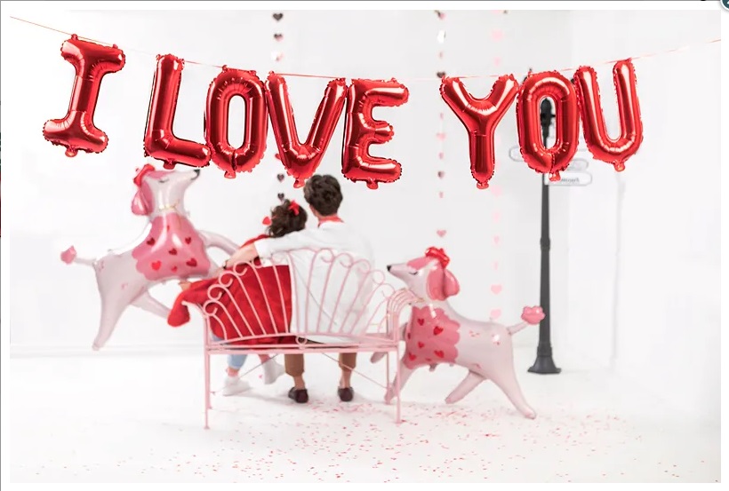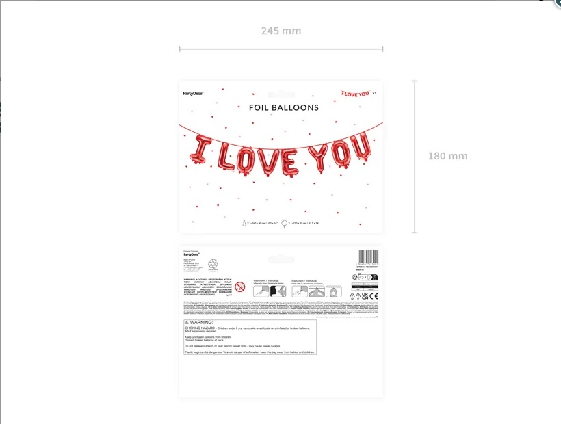 Foliový balónek ve tvaru nápisu I Love You, o velikosti cca 260x40cm. Balónek je vhodný pro nafukování vzduchem.