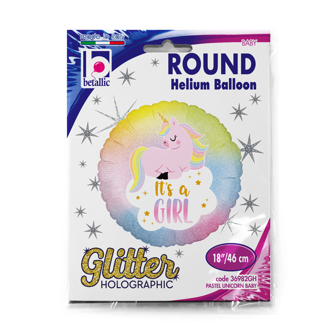 Foliový balónek ve tvaru kruhu s jednorožcem a nápisem "It´s a girl!" (je to holka!).