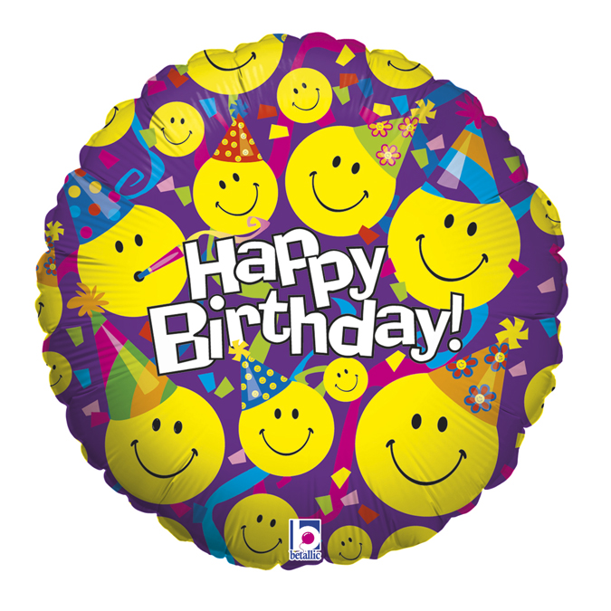 Foliový balónek ve tvaru kruhu s úsměvy a nápisem "Happy Birthday".