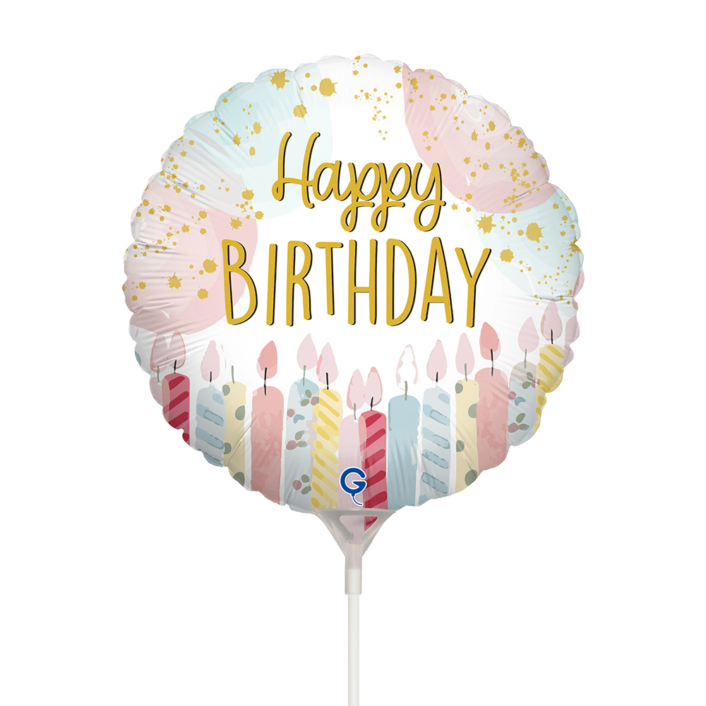 MINI foliový balónek ve tvaru kruhu v pastelových barvách se svíčkami a s nápisem Happy Birthday.