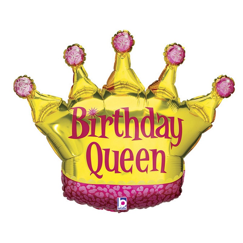 Foliový balónek ve tvaru krorunky ve zlaté barvě s růžovými detaily a nápisem "Narozeninová královna".