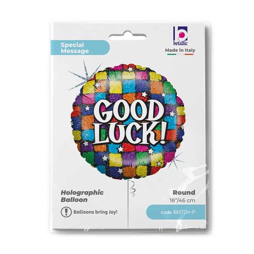 Foliový balónek ve tvaru kruhu s nápisem "Good Luck!".