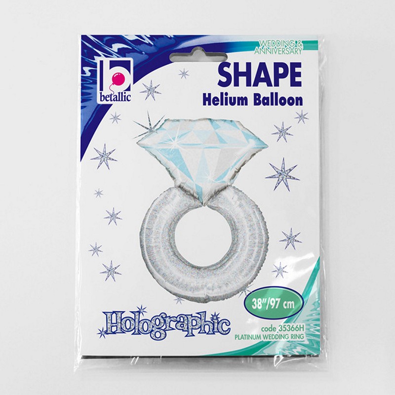 Foliový balónek ve tvaru zásnubního prstenu s diamantem v zářivě stříbrné barvě.