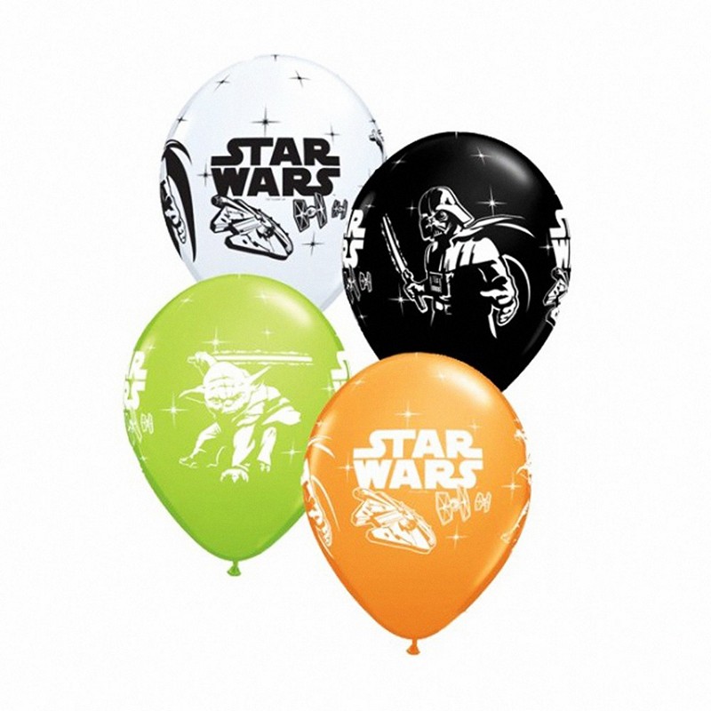 25ks pastelových balónků v černé, bílé, zelené a oranžové barvě s potiskem Hvězdných válek o průměru 28cm.