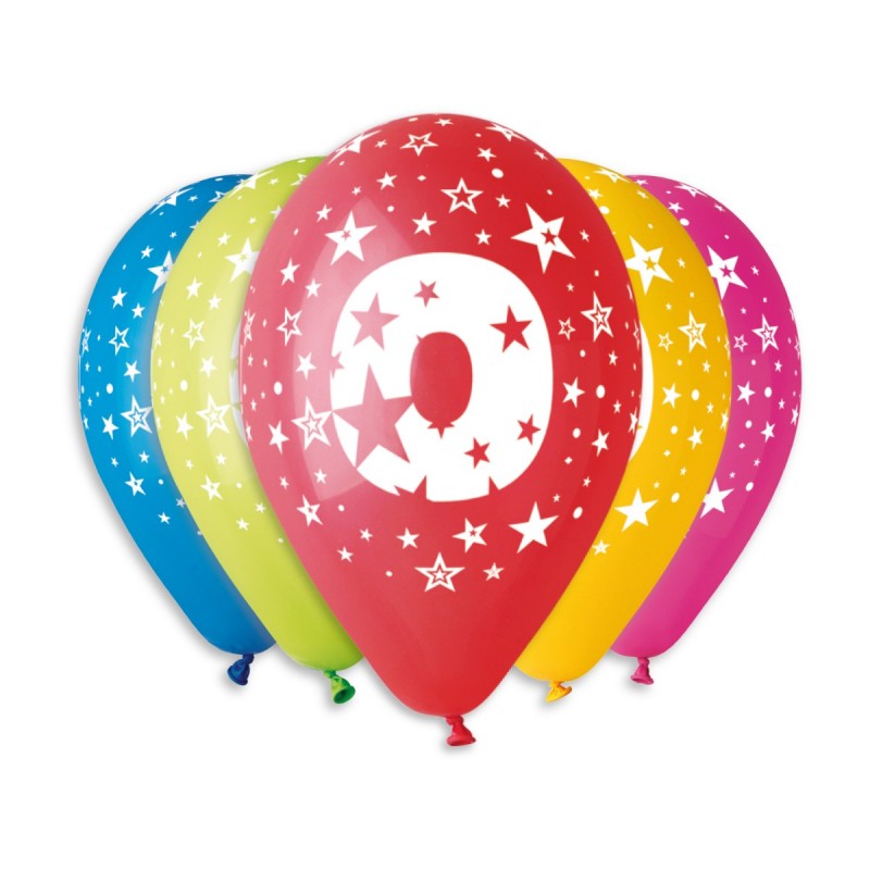 100ks pastelových balónků v barevném mixu s potiskem číslice 0 o průměru 30cm.