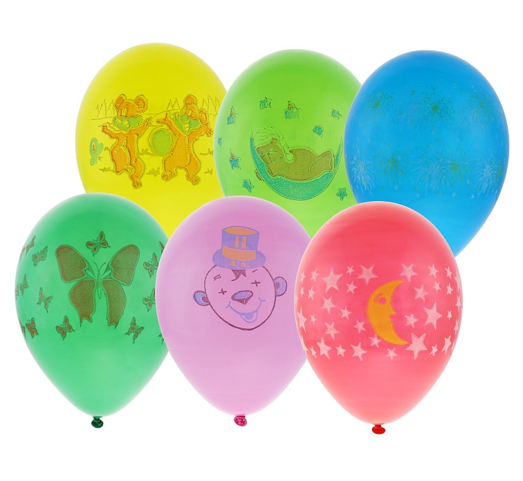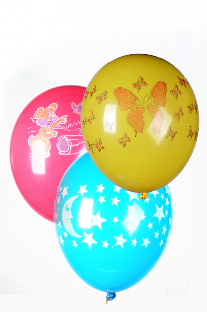 Nafukovací balónky potištěné různými dětskými motivy, v balení je kombinace pastelových barev balónků o průměru 26 cm.