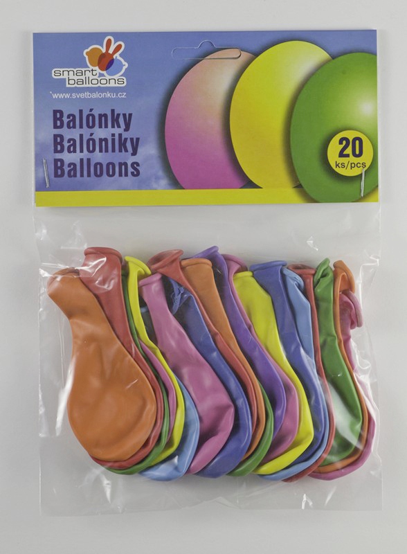 Nafukovací mix barevných párty balónků o průměru 19 cm v menším balení po dvaceti kusech.