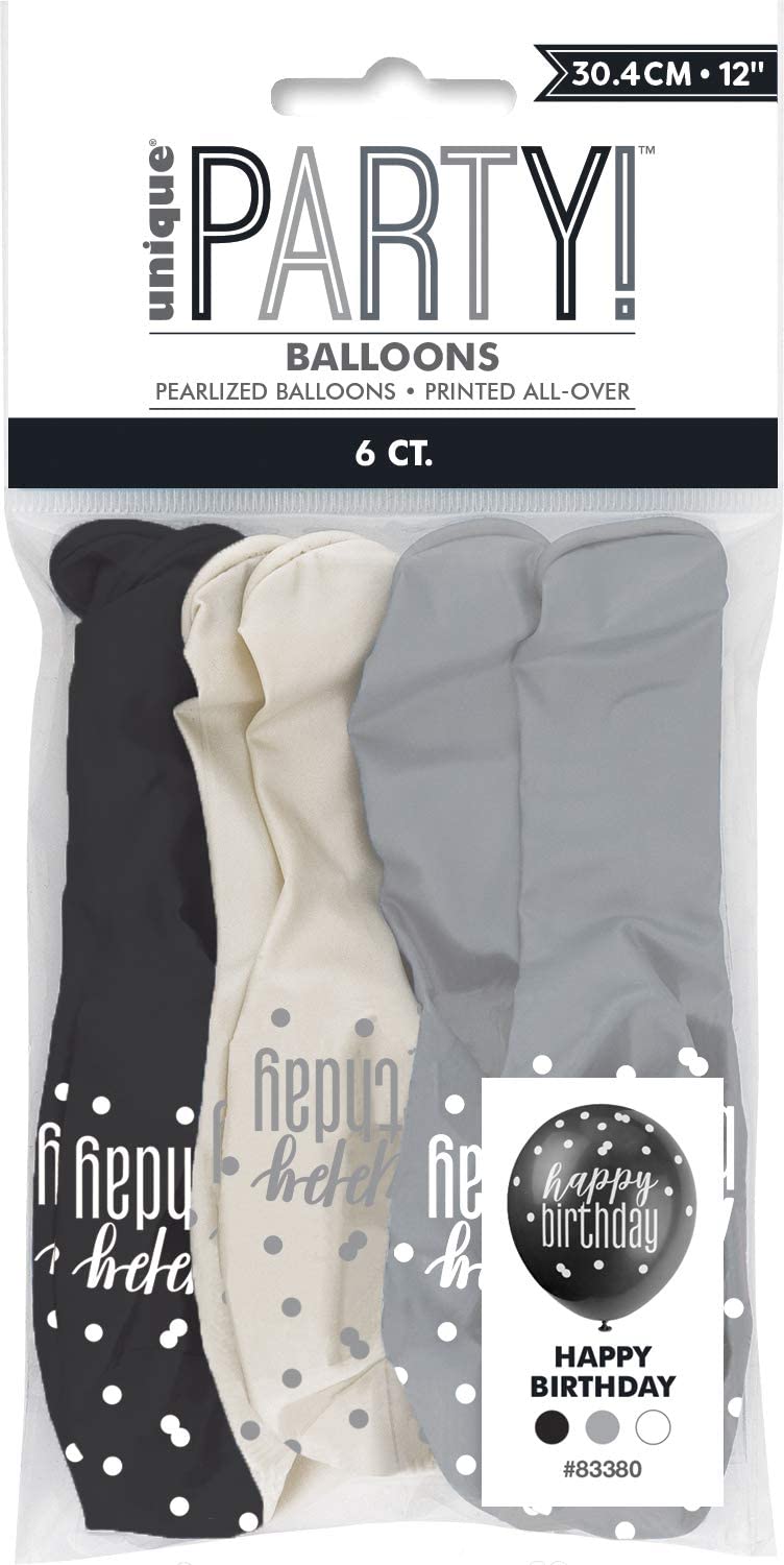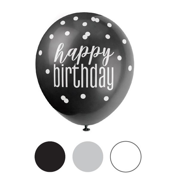 Latexové balónky v černé stříbrné a bílé barvě s potiskem Happy birthday.