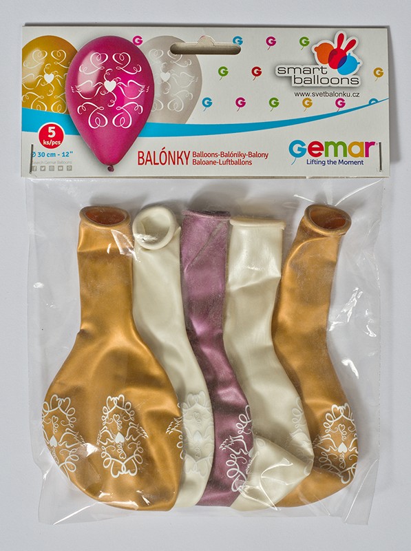 Nafukovací balónky s potiskem svatebního motivu dodáváme v metalickém mixu barev.
