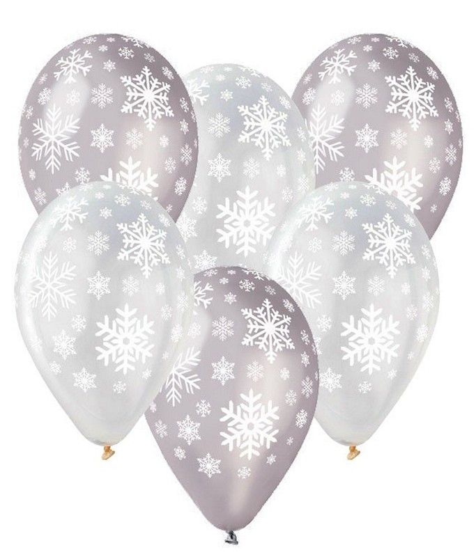Kulaté nafukovací balónky o průměru 30 cm v průhledném a stříbrném provedení celoplošným potiskem sněhových vloček, 5 ks v balení.